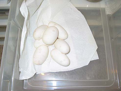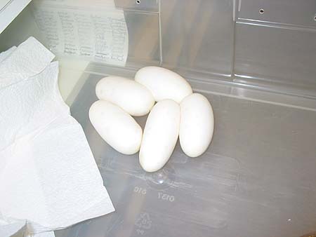 From breeding an Albino Male to a 50 % Possible Het Caramel Albino Female (PH Caramel 8 2002). This clutch should produce 100% Het Albinos, maybe some Albinos and possibly some Caramels????
