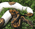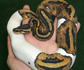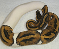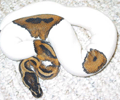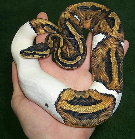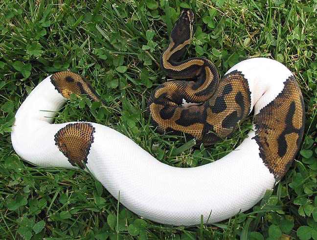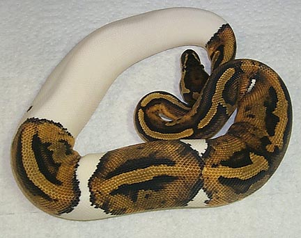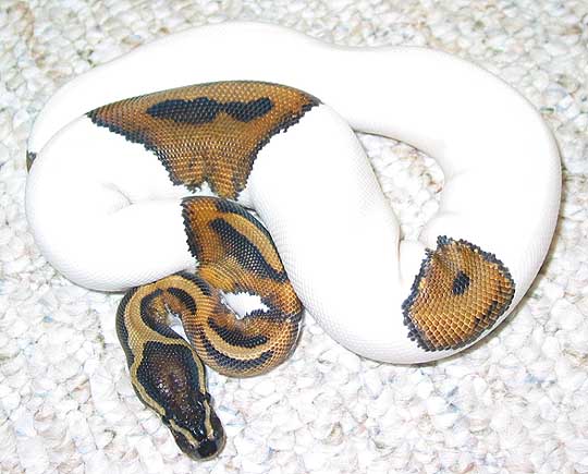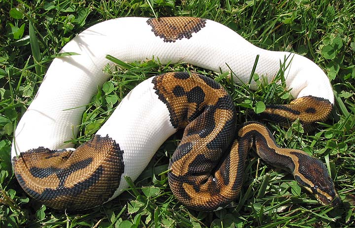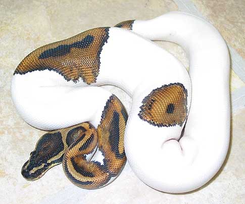 A Ball Python with patches of white randomly placed over the body and tail. The “non-white” patches of the animal are either striped or a blotched pattern as well as having intense colours of yellow, orange and light tan. The White is the most brilliant white seen on a snake.